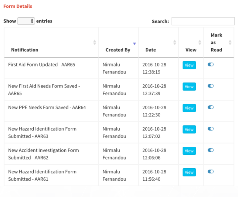All Notifications The All Notifications tab shows Manager all recently submitted forms in the organisation with date and time stamps, person who submitted them and the form ID.