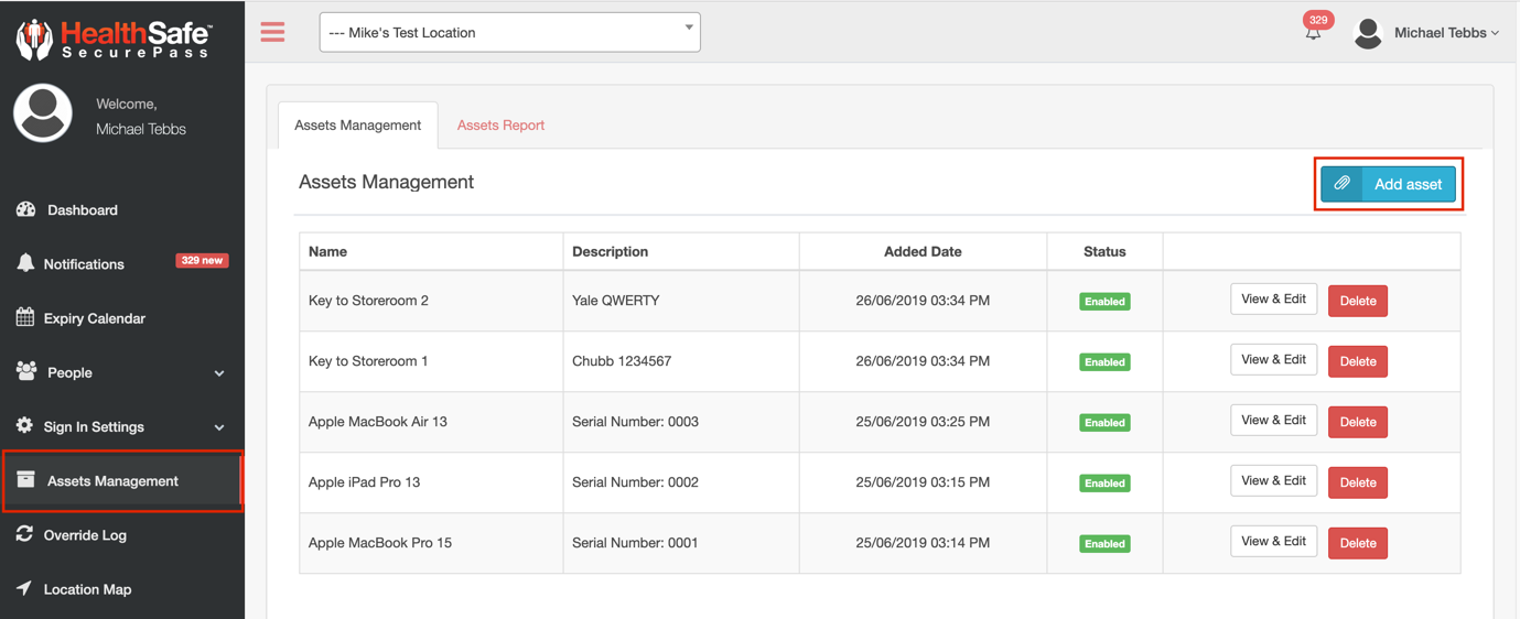 SecurePass allows Admins to manage the assigning of Assets to guests, whether they are Visitors or Staff or Casual Contractors or Contractors. The Assets are assigned after the guest has signed in and when they sign out, the return of these items is requested.
