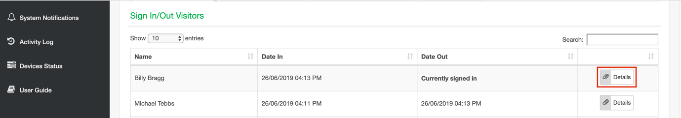 To assign assets to a signed in Visitor, go to the list of Sign In/Out Visitors list and select the Details of the Visitor.