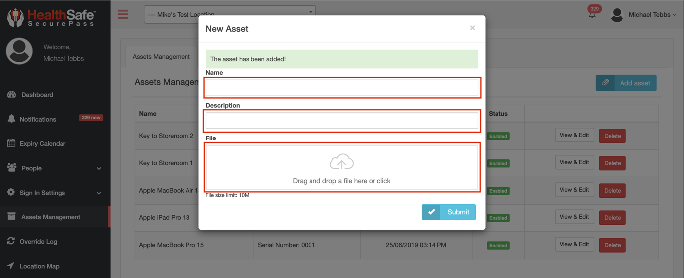 Admin can then create a new asset and add it to the library. A name and a description are given and an image can be added to the record if desired. Assets can include physical hardware such as Laptops or iPads, or they could be door keys. Assets can include any item that needs to be tracked.