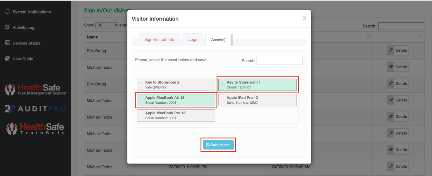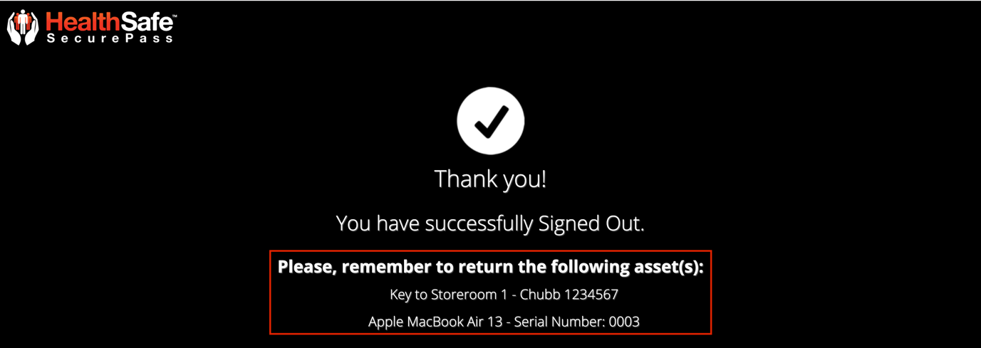 The Assets have now been assigned to that person for the remainder of their visit. When they sign out of the site, they are prompted to return these Assets.