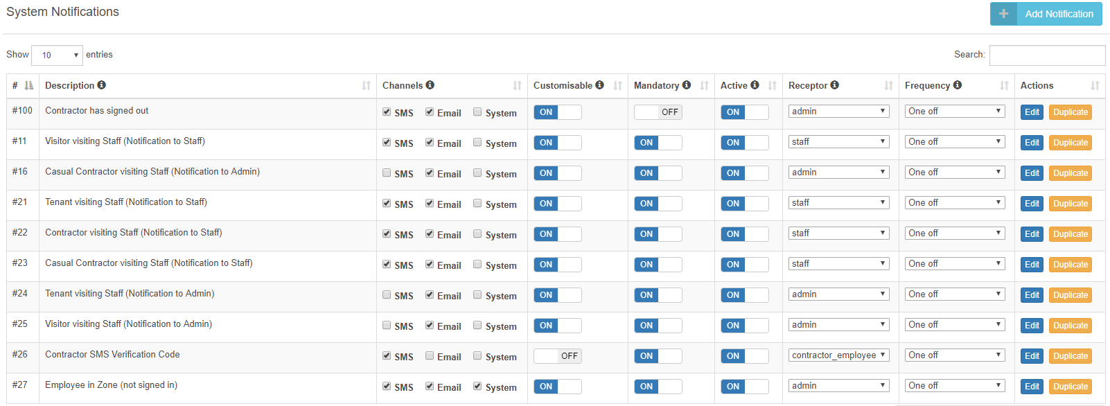Super Admin (i.e. a member of the HealthSafe Support Team) can configure the core notification features within the SecurePass system for Visitors, Contractors and Staff by clicking on System Notifications on the Admin Navigation Menu. Whatever the location(s), the SecurePass system will use this setup configuration to deliver notifications to users. Amendments and changes can be performed by clicking on the Edit button for each Description and selecting the respective preferences.