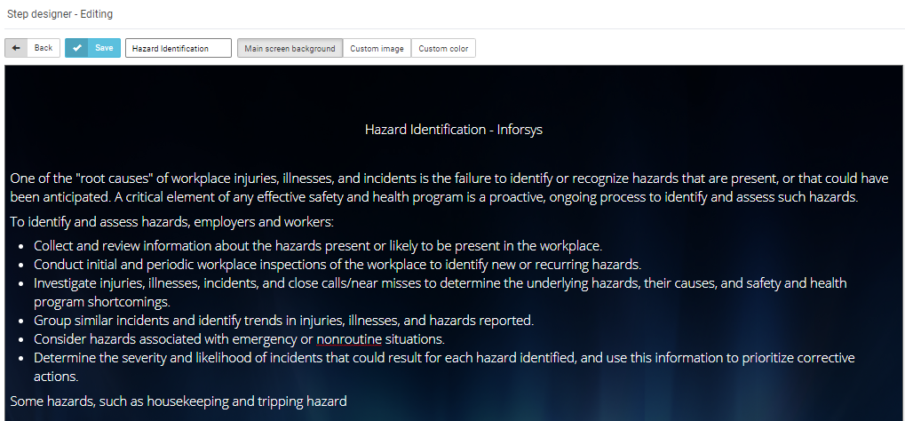 Admins can create or edit the Hazard Identification of the building by clicking on Safety Settings from the Admin Navigation Menu and by then selecting Hazard Identification. To create, select the Edit Step button located on the right hand side. Once completed, click on the blue Save button.