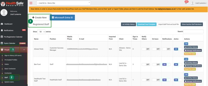 To add or create a staff member in SecurePass, navigate to People > Staff, then click the Create New button to input the new staff details and save them.