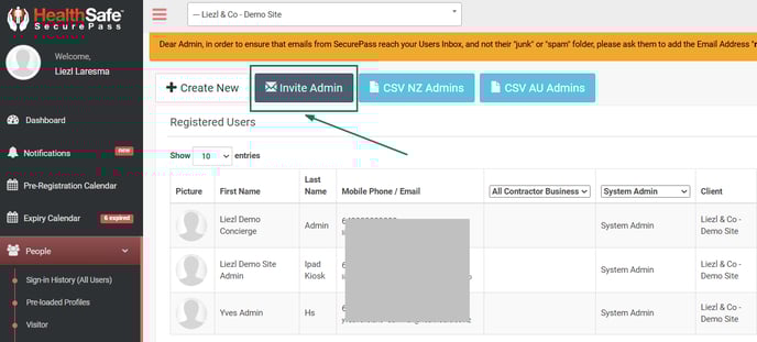 To invite a new admin to SecurePass, navigate to People > System Users, then click "Invite Admin" as shown below: