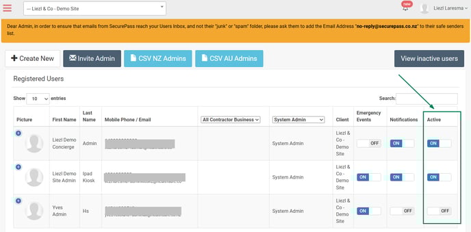 To make a system admin or user inactive in SecurePass, navigate to People > System Users, find the user you want to make inactive, and toggle the switch in the "Active" column to "Off," as shown below:
