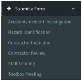 The Select a Form button reveals all available forms on the HealthSafe Risk Management System. This allows the Admin to submit any of the forms available below: